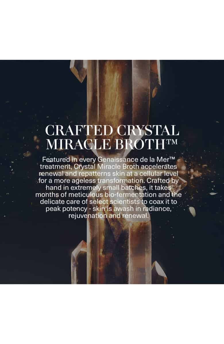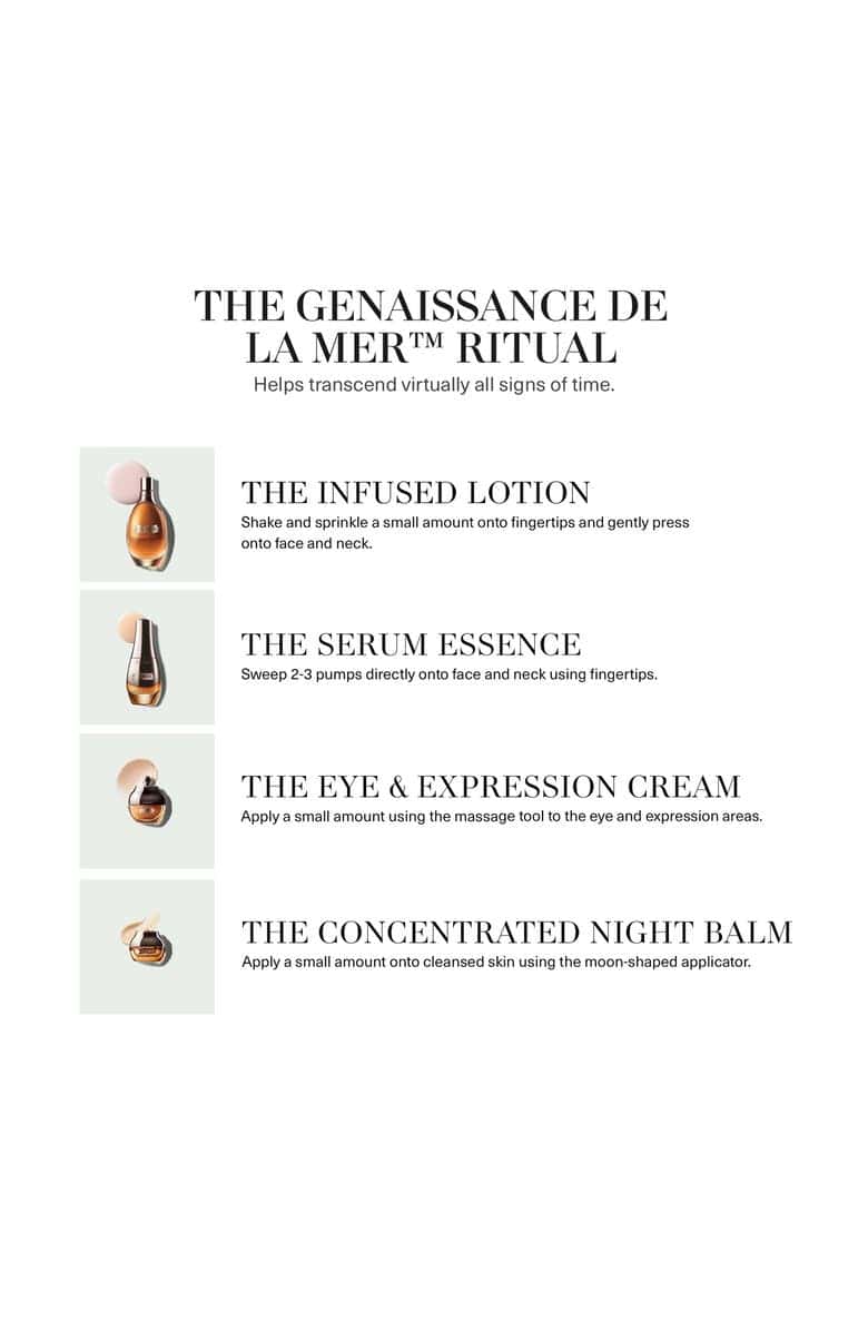 Best for: Normal skin, Anti-aging A limited-edition set filled with products that let you experience the profound potency and exquisite craftsmanship of La Mer’s most coveted collection that transcends virtually all signs of time. Set includes: – Genassiance de la Mer The Infused Lotion (5.07 oz.): a cream-infused, watery lotion that becomes pure velvet on the skin, hydrating, softening, strengthening and priming it for transformation – Genaissance de la Mer The Serum Essence (1.01 oz.): a serum formulated with hand-crafted Crystal Miracle Broth™ to accelerate renewal to support skin’s micro-symmetry and transcend virtually all signs of time – Genaissance de la Mer The Eye & Expression Cream (0.5 oz.): an eye and expression cream infused with Crystal Miracle Broth concentrate to visibly rejuvenate the eye and expression areas to transcend signs of time – Genaissance de la Mer The Concentrated Night Balm Moisturizer (1.69 oz.): a sumptuous moisturizer balm that accelerates skin’s natural renewal through anti-aging technology while you sleep After cleansing, gently shake The Infused Lotion. Sprinkle a small amount onto your fingertips and gently press onto a cleansed face and neck. Next, sweep 2–3 pumps of The Serum Essence directly onto your face and neck using fingertips. Using the ring finger, apply a small amount of The Eye & Expression Cream to the eye area and expression areas. Use the massage tool for smoothing and increased microcirculation.