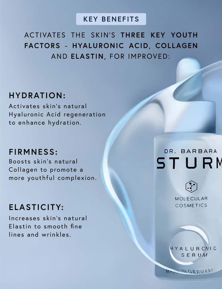 “My HYALURONIC ELIXIR is a fundamental. It is the ‘white t-shirt’ of any skincare routine. I packed my proprietary formulation with a high concentration of low, medium and high weight Hyaluronic Acid molecules that offer instant moisturization at the surface and deeper skin layers, boost skin barrier function and support lessen the formation of age lines.” – DR. BARBARA STURM