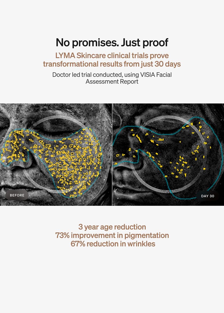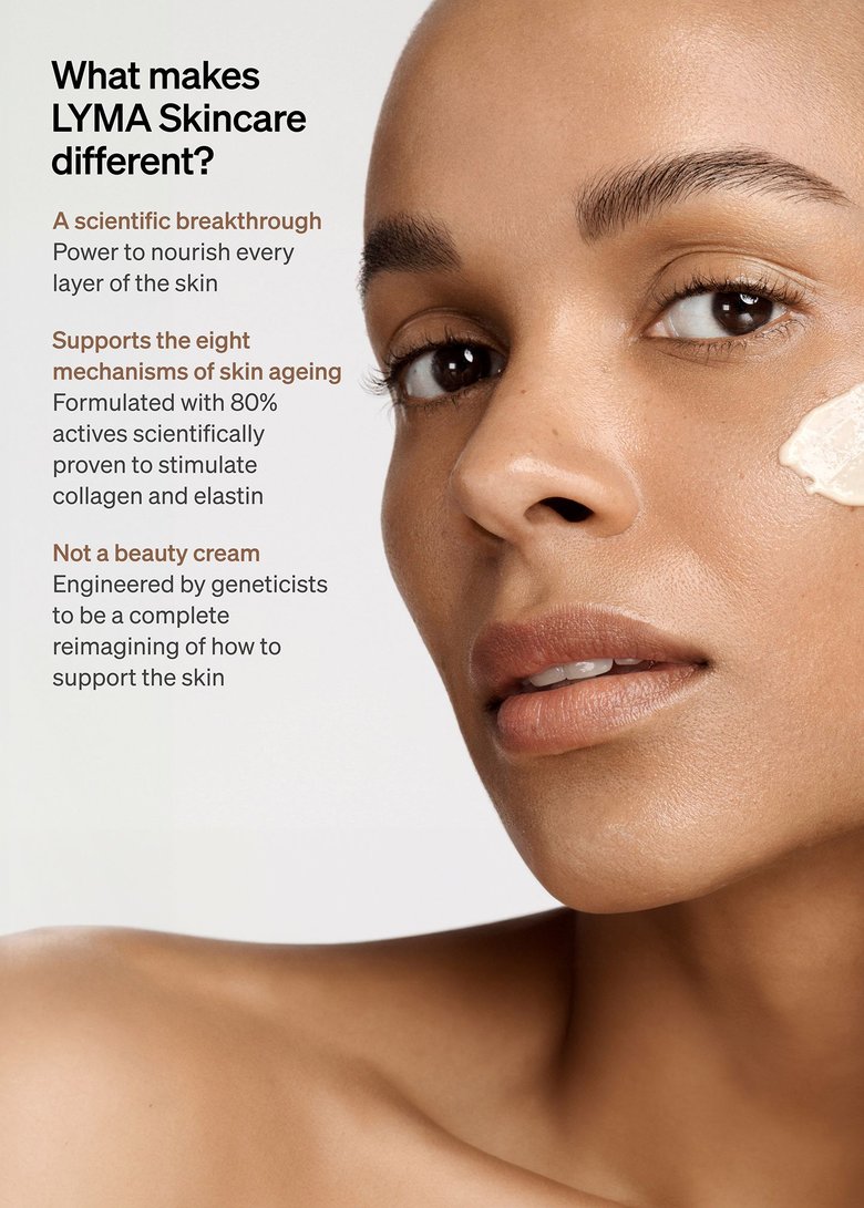 - Once fully absorbed, follow with three pumps of LYMA Cream, massaging softly into the face and neck until a white film forms. This is completely normal and is a sign that the formula is getting to work.
