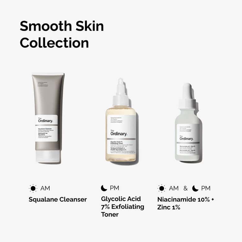 The Refined Skin surface Collection features preparations designed to focus on uneven skin surface feel and textural irregularities in travel-friendly sizes. First, prep the epidermis by cleansing with Squalane Cleanser . This cleanser is designed to productively cleanse the epidermis by removing makeup, dirt, and impurities, while also supporting the complexion’s moisturization protective layer through moisture. Next, apply Glycolic Acid 7% Exfoliating Toner . This preparation exfoliates the skin surface with daily usage and boosts dermal layer luminosity, evens skin surface tone aesthetic and smooths consistency. Finally, apply Niacinamide 10% + Zinc 1% solution. This universal solution balances excess oil to aid minimize signs of congestion. Niacinamide 10% + Zinc 1% heroes a high concentration of niacinamide, supported with complementary Zinc PCA, for enhanced penetration of this multi-functional ingredient.