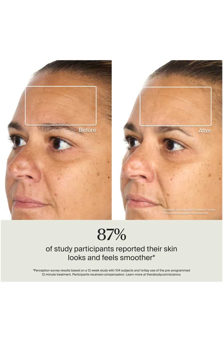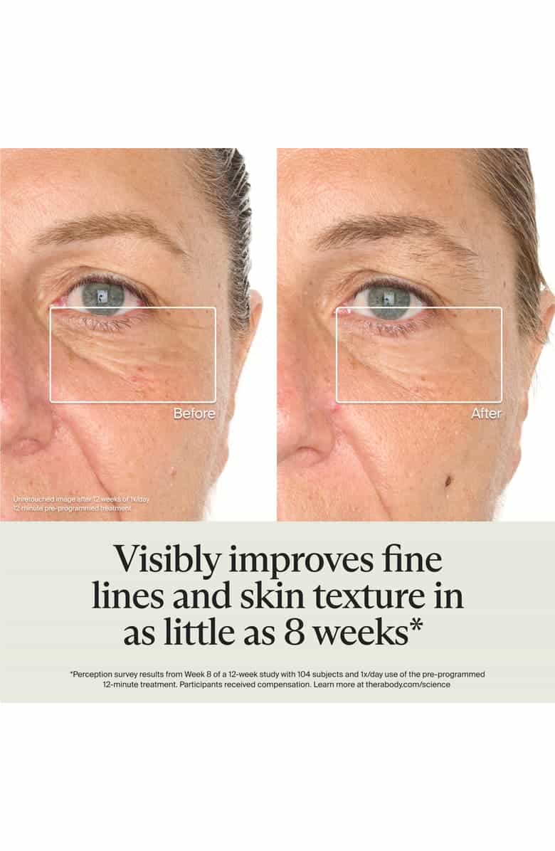 What it does: Featuring 504 medical-grade LEDs and a cordless, lightweight and breathable design, TheraFace Mask Glo delivers an effective full-face treatment in just 12 minutes. The clinically proven light doses visibly reduce fine lines and wrinkles, firm and tighten skin, and even tone and texture in as little as 8 weeks*—all at our best price yet. *Clinically proven results associated with equal light doses during 12 week clinical study with 31 subjects and 1x/day use of pre-programmed treatment. Learn more at: therabody.com/science Features and benefits: – Developed with leading dermatologists and skincare experts, 3 clinically-proven light modes address a range of skin concerns: red light therapy helps reduce fine lines, wrinkles and dark spots; red + infrared light stimulates collagen production and firms skin; blue light fights acne and acne-causing bacteria – 504 medical-grade LEDs provide an even, full-face treatment – The preset 12-minute treatment cycles through four minutes of each light therapy to boost collagen production while diminishing wrinkles, discoloration and acne. Or choose from individual 4-minute red, red + infrared, or blue light treatments for personalized results – The proprietary VibraWave technology provides a gentle scalp massage with three settings for a spa-like experience—relax for low-frequency, refresh for higher-frequency and relieve for a wave-like sequence. Use on its own as a 12-minute treatment or turn off during any LED therapy – Cordless, lightweight design with a breathable fit that hovers just above your skin for comfortable multi-tasking without cords or clunky remotes – Made with medical-grade silicone and a smooth matte finish for easy cleaning at home or on the go – Science is the foundation of Therabody’s product development, with 26 completed studies, 25 ongoing and 75,000 supporting scientific articles. Every product is scientifically validated from concept to completion for trusted results. TheraFace Mask Glo is an FDA-cleared medical device.