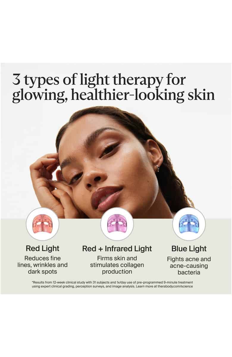 What it is: TheraFace Mask Glo is a dermatologist-approved, FDA-cleared LED mask that combines red, red + infrared and blue light with a relaxing scalp massage for glowing, healthier-looking skin.