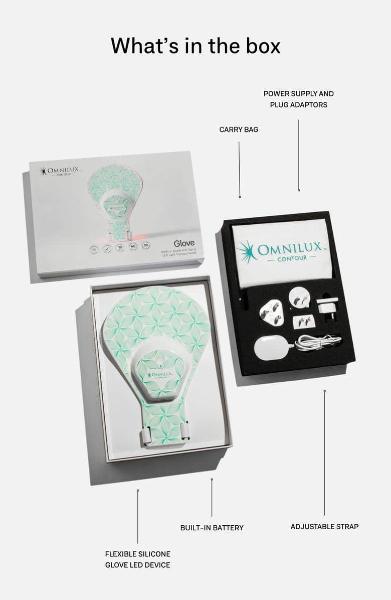 What it does: Engineered using Omnilux’s proprietary medical technology, the Contour Glove harnesses the anti-aging and anti-inflammatory benefits of red (633nm) and near-infrared (830nm) light to help visibly reduce signs of aging. It may also help alleviate pain and discomfort caused by joint conditions*. *Omnilux Contour Glove is regulated by the FDA for the treatment of pain Features and benefits: – May help visibly improve the appearance of wrinkles, pigmentation and uneven skin tone – May help reduce inflammation, pain and irritation Includes: – Silicone Glove Device – Power Supply and Plug Adaptors – USB C line to Outlet Connector – Adjustable Straps – Carry Bag